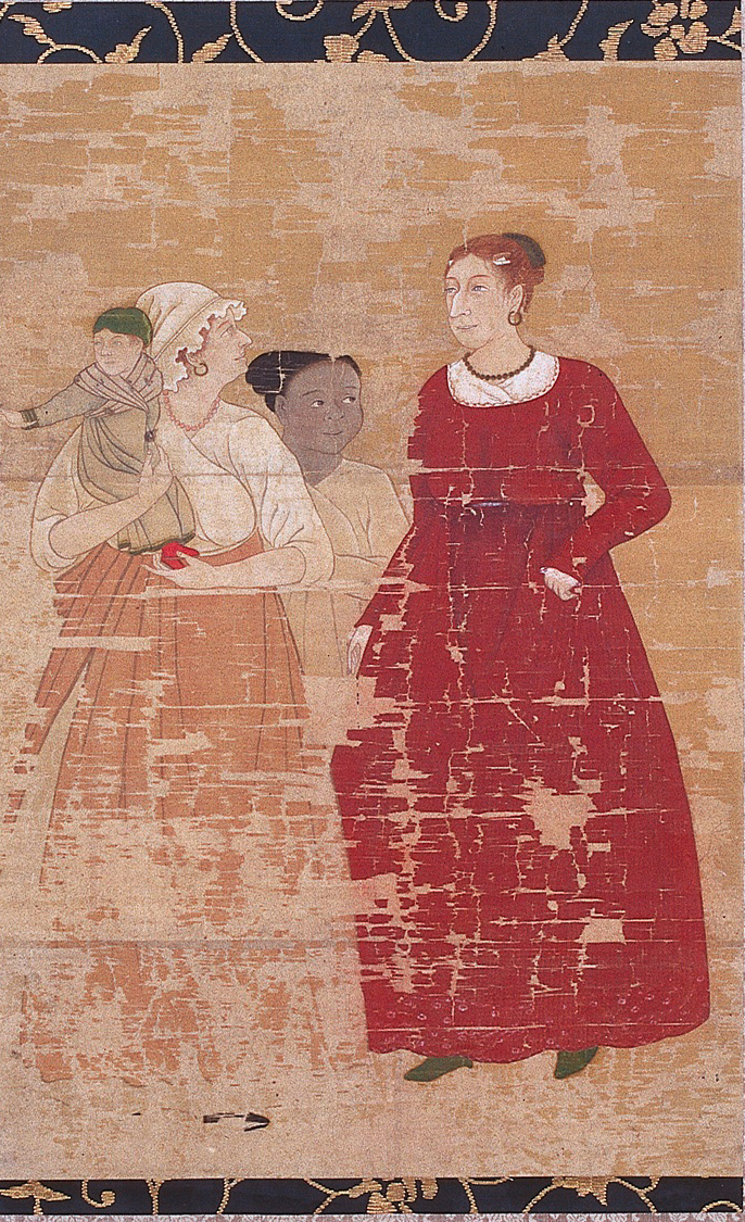 (Above) Another view of the Blomhoff women and child. Johannes is in the arms of Petronella; Titia is in the red dress; Maraty between them.