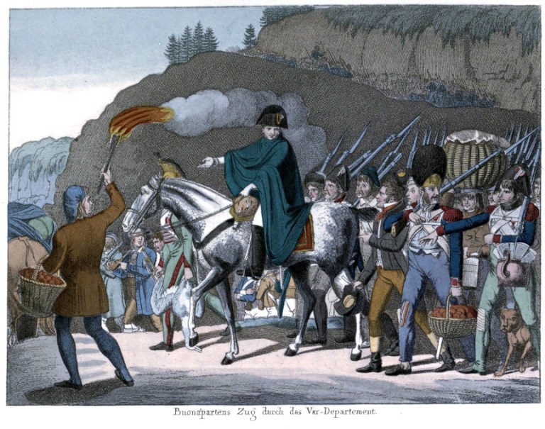 [Above] A contemporary German print of Napoleon marching through the Alps on his way from Golfe-Juan toward Paris in March 1815. Through charisma, luck, audacity and the wise policy of not tempting areas with heavy pro-royalist sentiments, Napoleon managed to avoid major confrontation with Bourbon forces on his march through France. Most of the soldiers sent out to arrest him ended up joining him, swelling the armies that would ultimately take the field at Waterloo. Note all the food and supplies the soldiers are carrying.