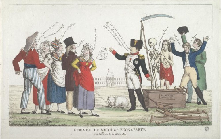 [Above] A contemporary French cartoon depicts Napoleon’s return to power on March 20, 1815. Note the Grim Reaper standing behind him and the emaciated woman in rags, suggesting the ruin that Napoleon has in store for France.