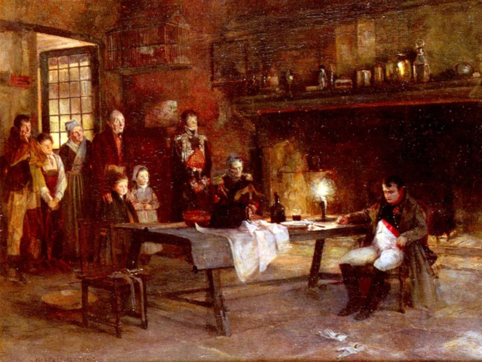 [Above] A somewhat fanciful depiction of Napoleon’s return depicts him much as he appeared in 1812, with tricolor flags flying and jubilant soldiers throwing themselves at his feet. While some members of the French Army were glad to see their old commander return, many people in the countryside were less than enthusiastic. Napoleon tended to wear a plain green grenadier’s coat and cut a somewhat less majestic figure.