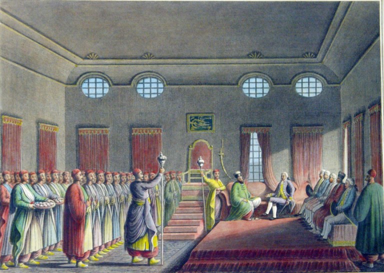 [Above] The interior of the Curtea Nowa, the palace in Bucharest where the hospodar traditionally ruled—until it burned down the night Caragea arrived in December 1812. This view shows a scene in the palace in which British diplomats were received, circa 1806. The palace was less than 40 years old at the time of its destruction and was not rebuilt.