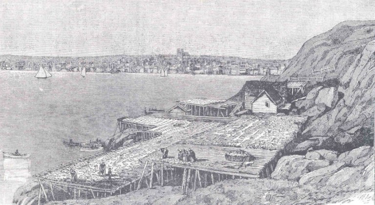 [Above] Curing cod on the Newfoundland coast, early 19th century. The process of curing or drying fish, principally codfish, was vitally important to the livelihood of St. John’s. As fish spoils easily and quickly, and St. John’s was so distant from most centers of commerce in the Atlantic world, preservation was key despite the laborious nature of either drying or salting the catch. This process has been repeated in numerous fish-based coastal economies across the centuries; the Norse fishermen of Bergen, for example, were doing it in the 10th century.