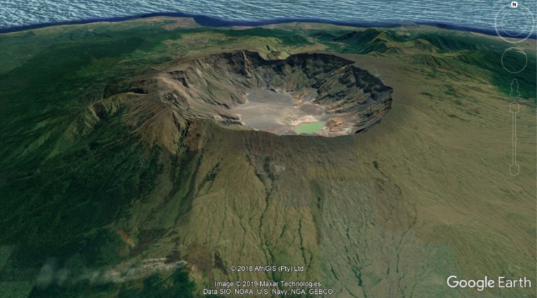 [Above] Mt. Tambora, on the island of Sumbawa, Indonesia, as seen from modern satellite photography. The mere appearance of this gigantic crater attests to the incredible violence of the April 1815 eruption. Before the blast, Tambora was said to resemble Mt. Fuji in Japan. Now it’s this: a scarred, hollowed-out landscape that wouldn’t look out of place on the Moon.