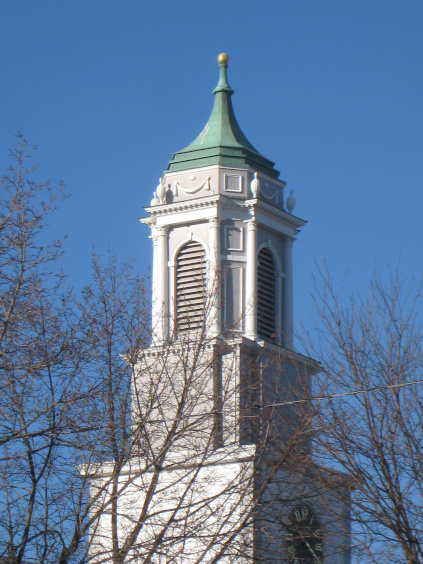 [Above] The belfry of Calvary Methodist Church in Arlington, Massachusetts—which was also the belfry of Boylston Market. The church became interested in the belfry when its architect, James MacNaughton, heard that the Bolyston Market architect, Charles Bulfinch, had planned a similar belfry for King’s Chapel in Boston which could not be built due to cost. Additionally, the Calvary Methodist Church itself was facing overruns, and acquiring the old Boylston Market belfry did double duty as a cost-saving measure.