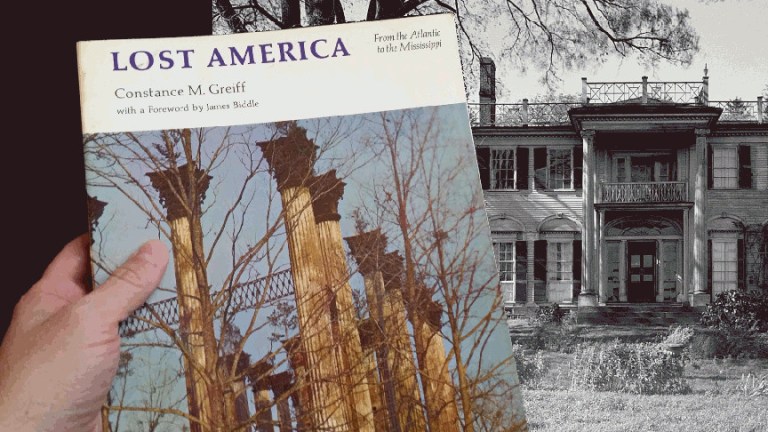 [Above] The header image of this article, shown here with a copy of Constance Grieff’s book Lost America, depicts the DeWolf-Middleton House, also known as Hey Bonny Hall, pictured in either 1934 or 1937.