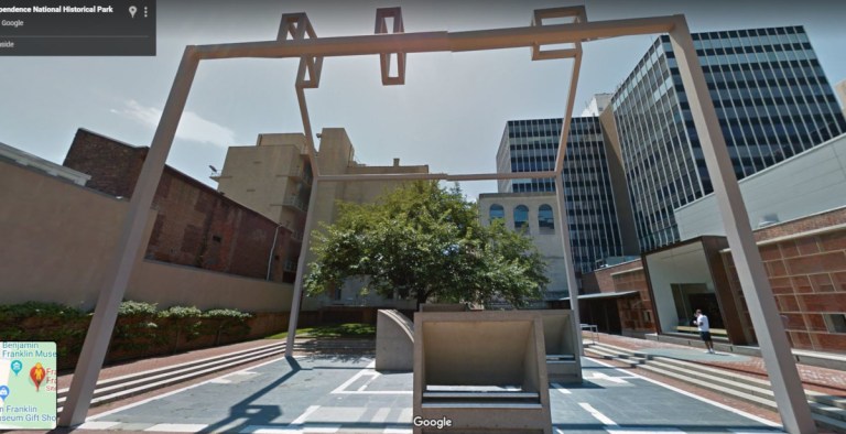 [Above] Google Street View maps of the site where the house of Ben Franklin stood, roughly in the position of the steel frame, between 1762 and its short-sighted demolition in 1812. The National Park Service has conducted archaeological digs on the site, and the concrete windows looking down into the ground offer views of what’s been excavated as the foundation of the buildings. Alas, this is all we have left of Franklin’s house.